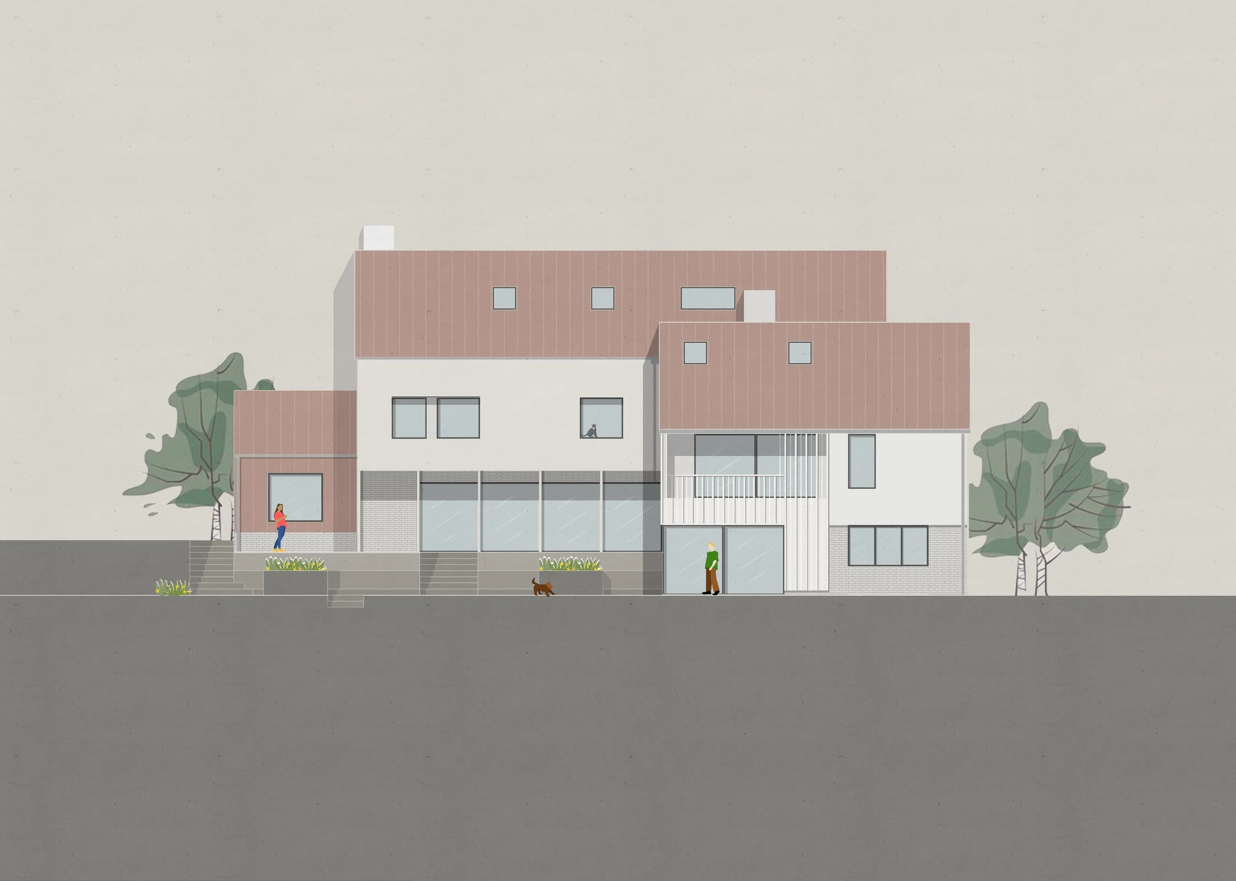 HSA explored circular economy principles and proposed robust materials; carefully detailed. Drawing inspiration from the surrounding coastal landscape and the soft pink hues from shells we picked up from the local beach, our design settled on a soft pink zinc roof with overhanging eaves & gutter details offering protection to the rough cast render & pre-weathered timber cladding.