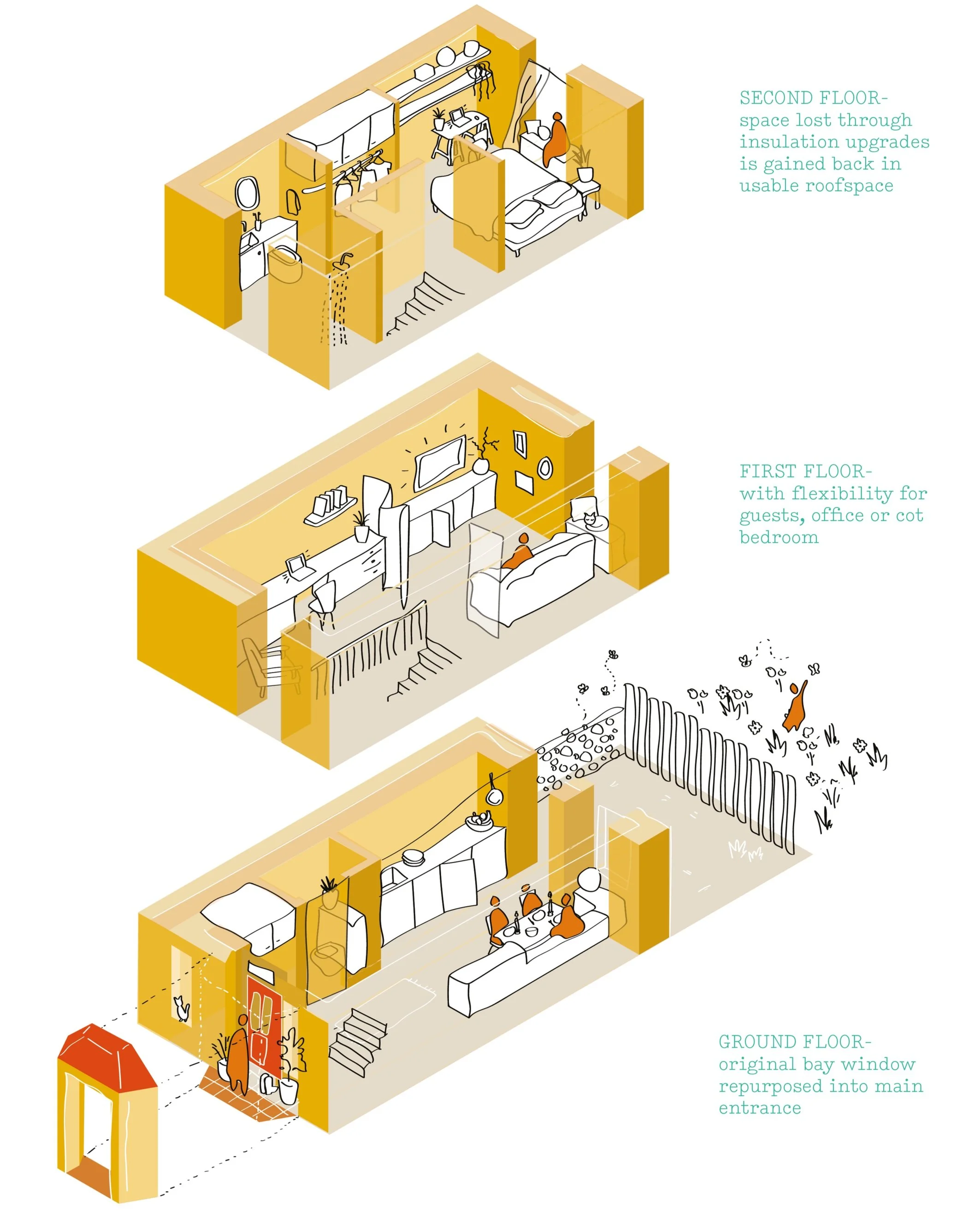 “A joyful and engaging submission demonstrating an understanding of the challenges of back-to-back Victorian terraces and how these could be adapted to turn the small existing footprints into comfortable, energy-efficient homes, with much needed outdoor amenity space for communal gardening.”