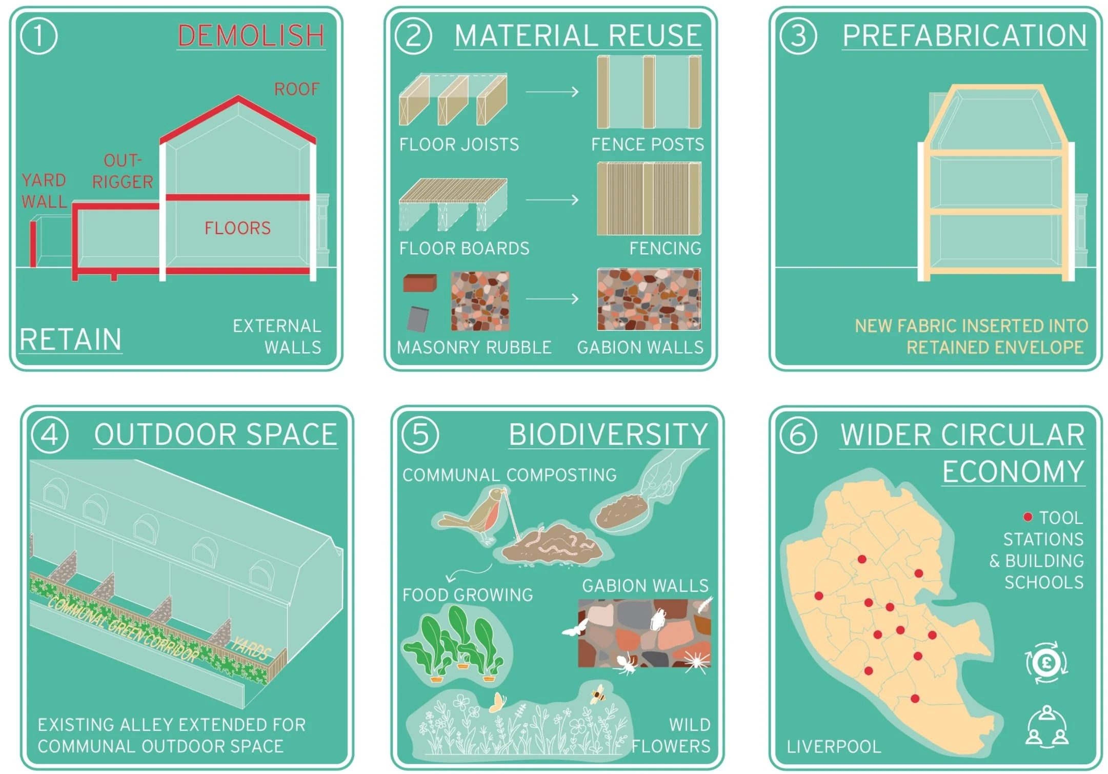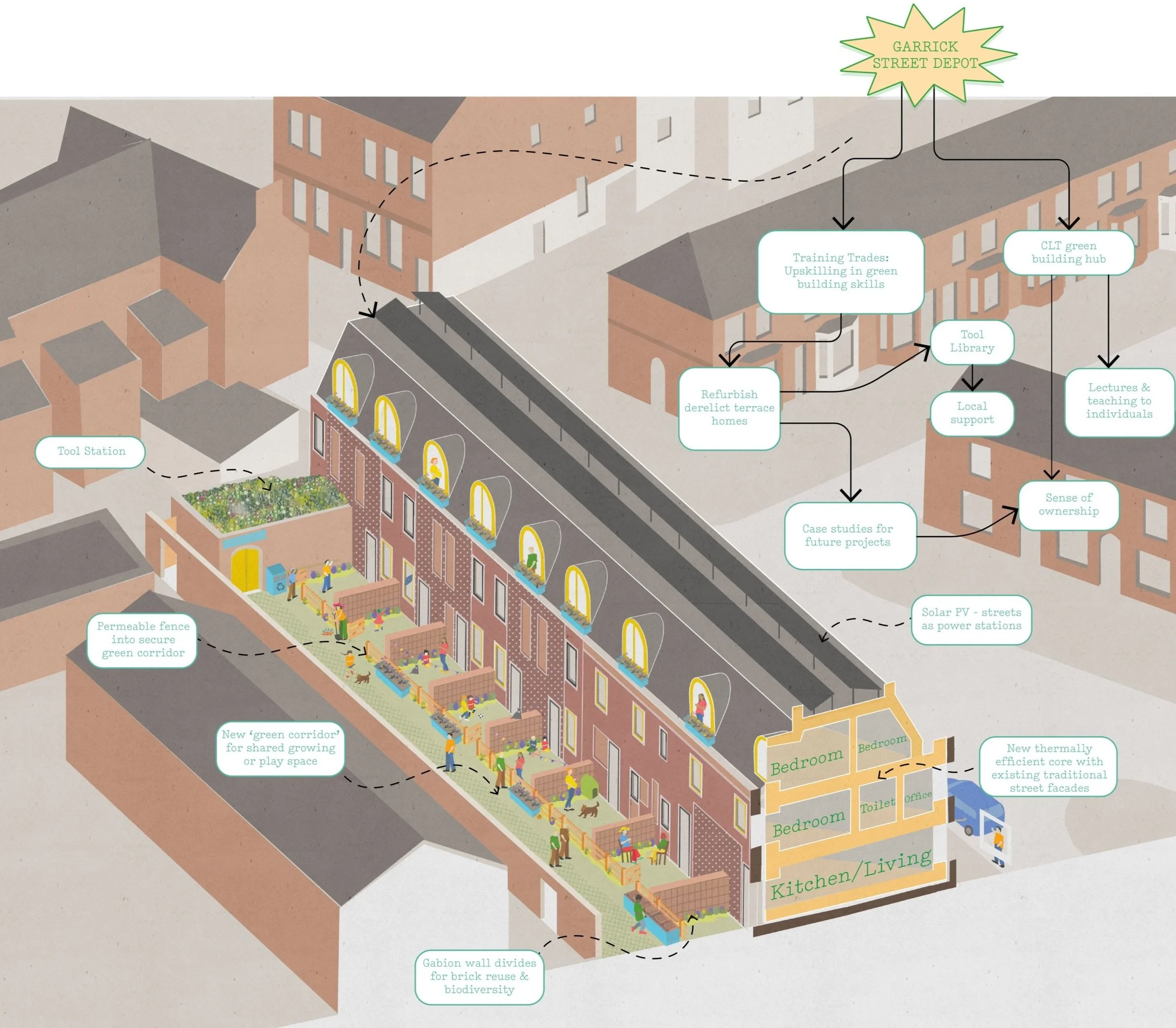 The competition looked for innovative redesign or refurbishment solutions for a row of 11 terraced dwellings, in Wavertree, Liverpool that tackled Net Zero and Lifetime Home residential redevelopment. Current land value will never meet the cost of refurbishment, however, over 26% of property stock in the UK is terraced housing in various conditions. There is no carbon budget to ignore this fact. This proposal tackles the challenge of bringing back into use those properties in an uninhabitable condition.