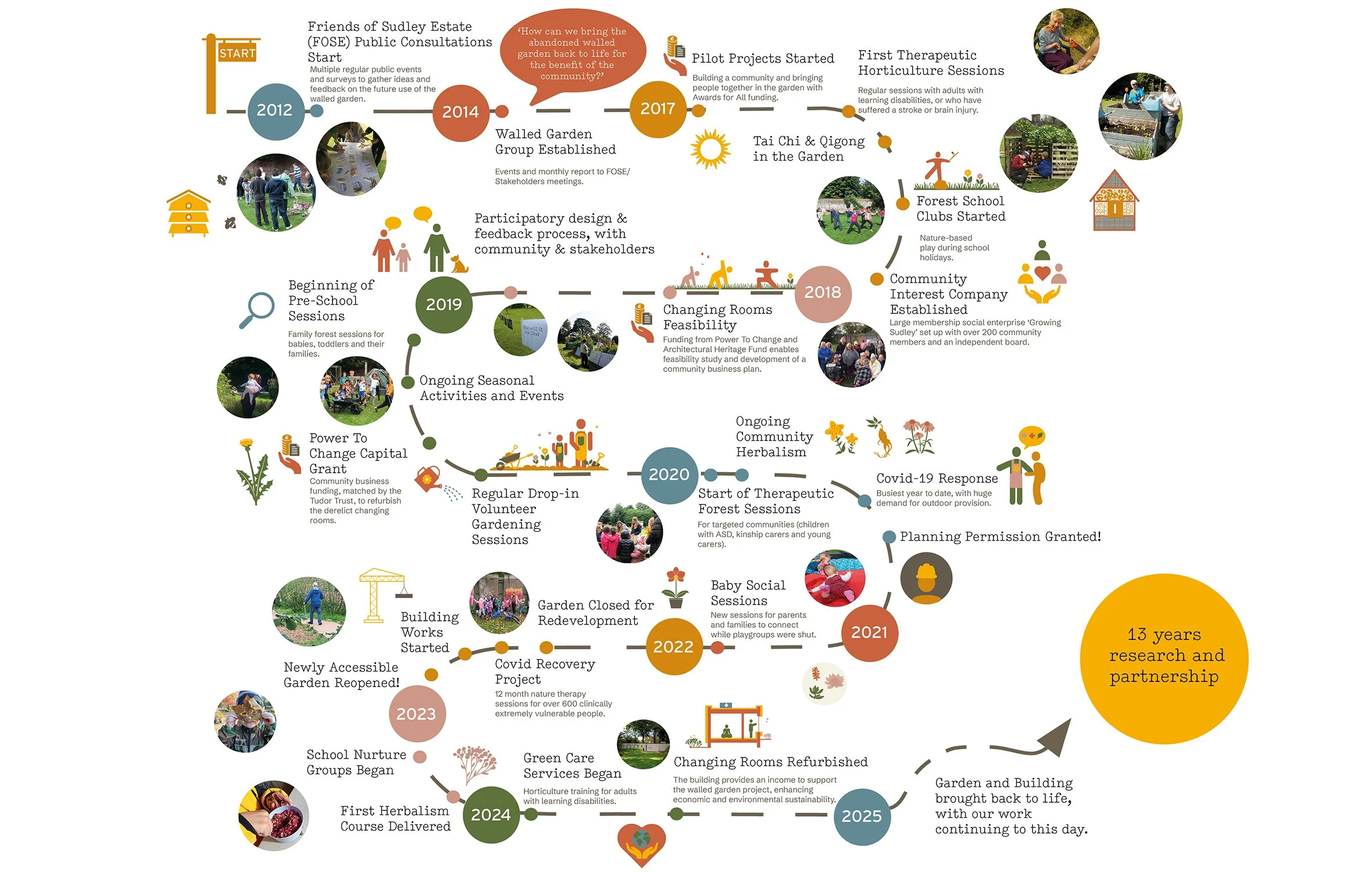 The pilot projects at Growing Sudley played a pivotal role in holistically developing a vision for the garden and wider organisation. These early initiatives continued to grow community involvement at a grassroots level and provided invaluable insight into what makes a truly functional, inclusive outdoor play and therapy space. Community ideas and feedback were directly woven into the final garden design developed with Howard Miller.