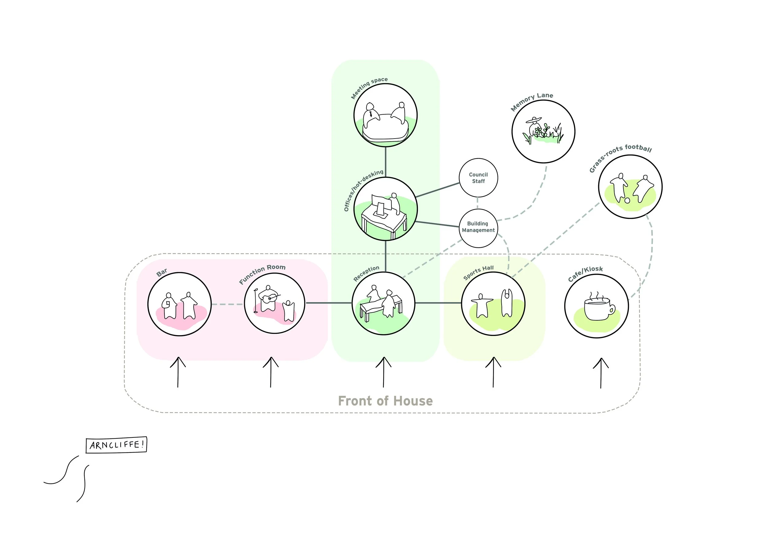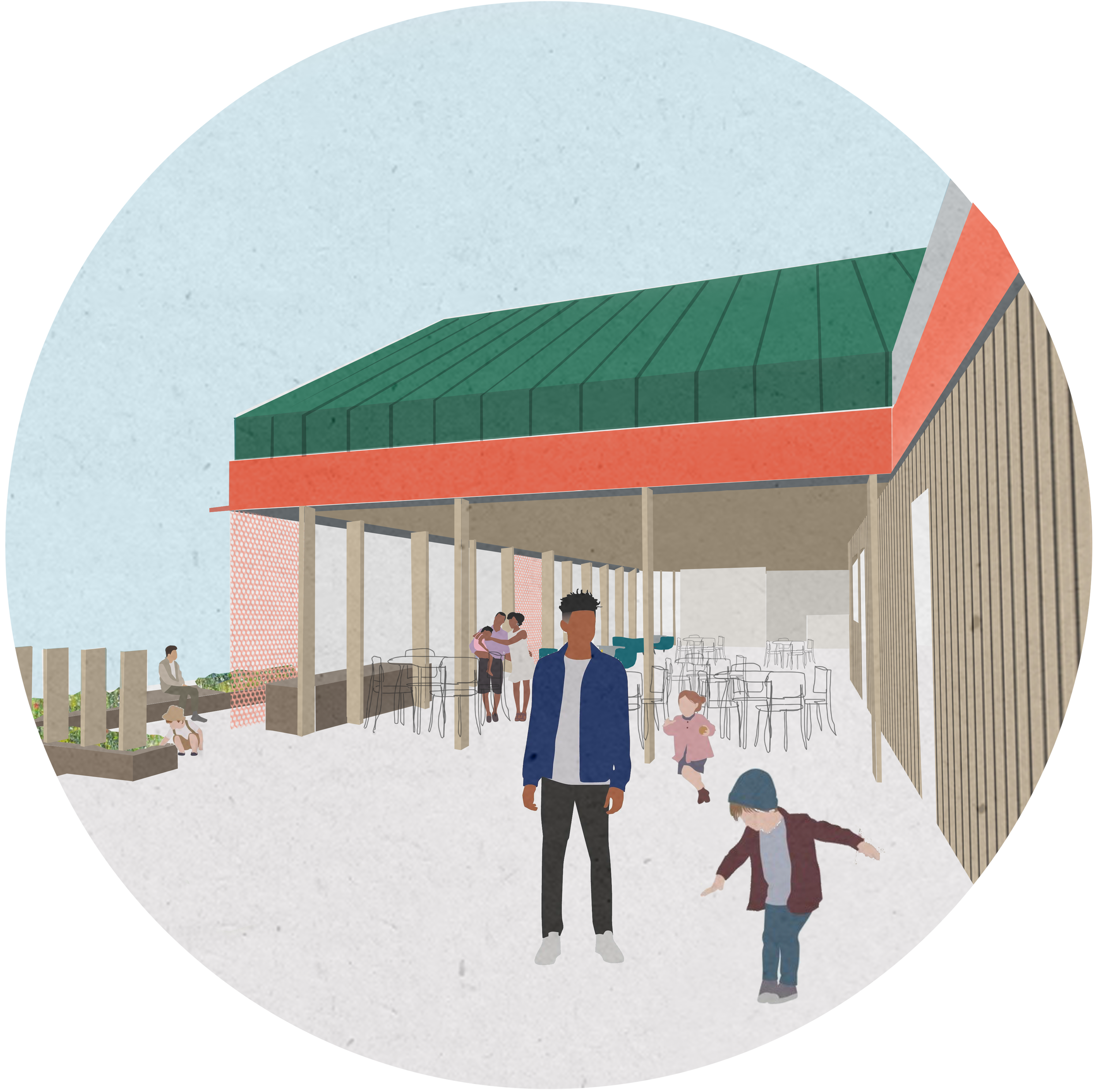Designs for the new entrance and café offer a safe place to meet friends and get reasonably priced or free healthy food and drinks. There is also an external covered terrace for when the building is open, which facilitates better indoor/outdoor provision and monitoring. The inclusion of several separate meeting spaces allows for flexible uses from education to confidential meetings. Simple changes such as centralising the toilets and providing separate entrances and circulation between the two main function spaces will mean that multiple activities can happen concurrently.