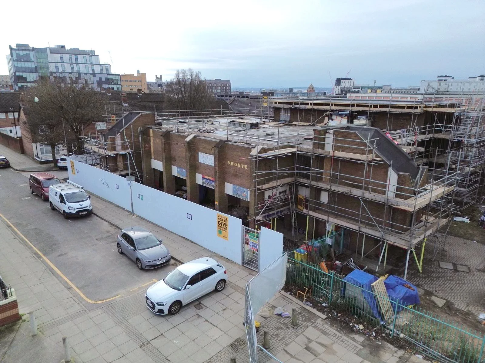 The Bronte is a two-storey brick-built, mixed-use building that is currently undergoing a deep retrofit. This includes making fabric upgrades as well as utilising low-carbon and renewable technologies like air source heat pumps, MHVR and solar panels