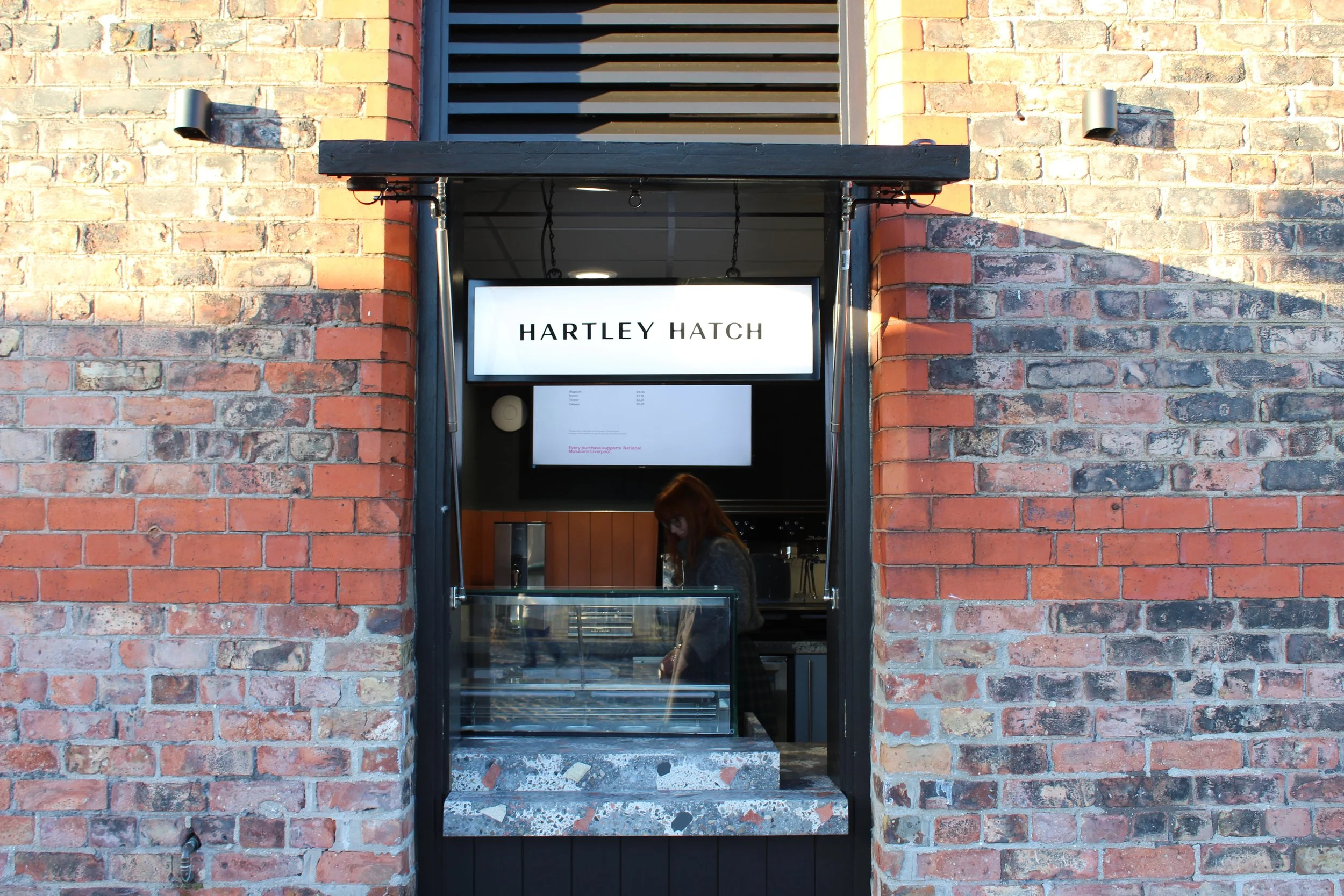 The proposal takes precedence from the Conservation Area setting and stories of the waterfront, including the ‘sugar story’ (its transport, commodity during the Victorian era and the terracotta sugar moulds uncovered on the nearby site), influencing the material palette. This sensitive refurbishment includes a new stained accoya timber frame and opening ‘hatch’, set within the existing door opening. Red brick waste, from the minimal alterations completed internally, has been cast into the new worktop counter (Granby Rock). When the hatch is closed, only the edge of the new countertop is visible, as a nod to the new insertion in the space. The hatch opens vertically, revealing the space whilst also providing shelter for customers on rainy days. Externally, the existing granite setts have been relaid for level access.