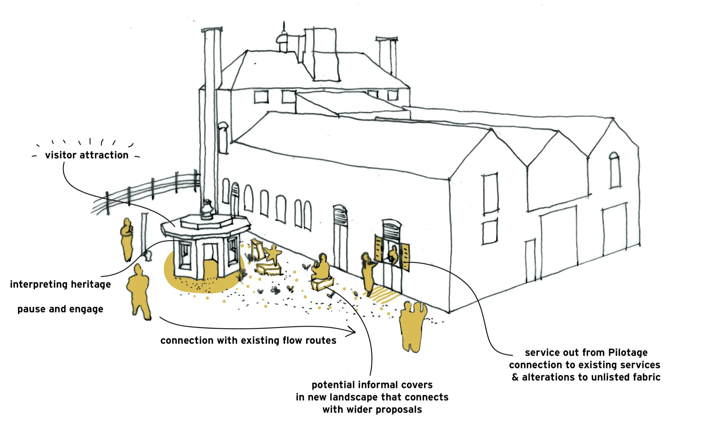 Early design sketch exploring the relationship between the Hartley Hut and Pilotage hatch as extension to the public realm