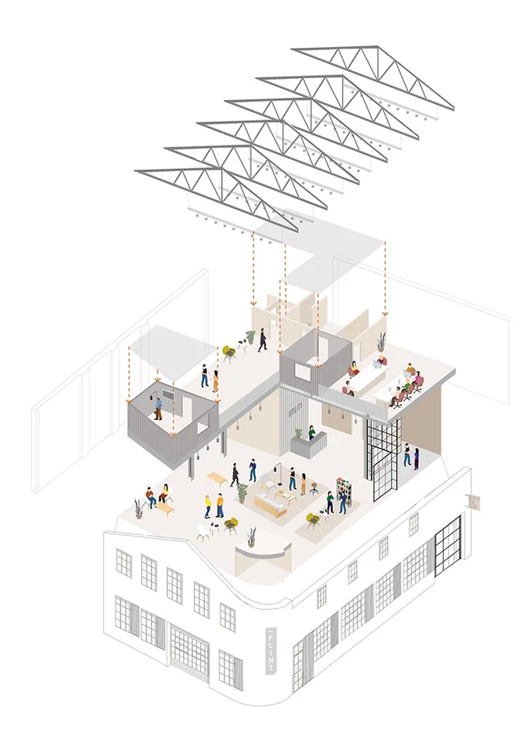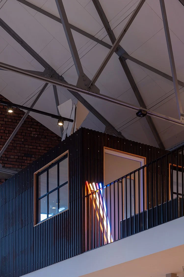 To achieve this, the existing roof was preserved and upgraded with non-fibrous insulation, allowing for a quicker and simpler installation process. The use of steel and cement-based materials was kept to a minimum; instead, the ground floor, mezzanine, and partitions were constructed from locally sourced timber. Treated plywood was used to clad the ceilings, while the original roof trusses were retained to maintain the building’s character. Additionally, solar panels were installed to support energy efficiency and further reduce the building’s environmental footprint.
